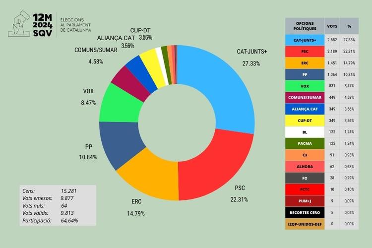 Junts+ ha estat la força més votada en aquestes eleccions al Parlament de Catalunya a Sant Quirze del Vallès, amb un 27,33 % dels vots. Aquest percentatge es trasllada en 2.682 vots per a la formació encapçalada per Puigdemont.